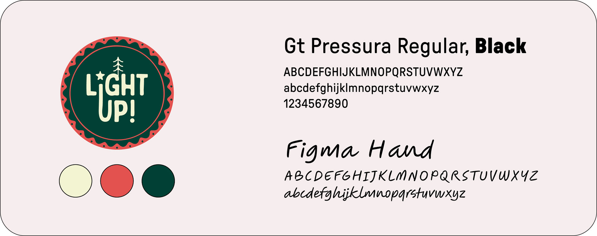 The use of off-white, cut-out lettering, noise, and holiday-related graphics were the technique takeaways from gathering inspiration for Light Up’s visual system and branding.