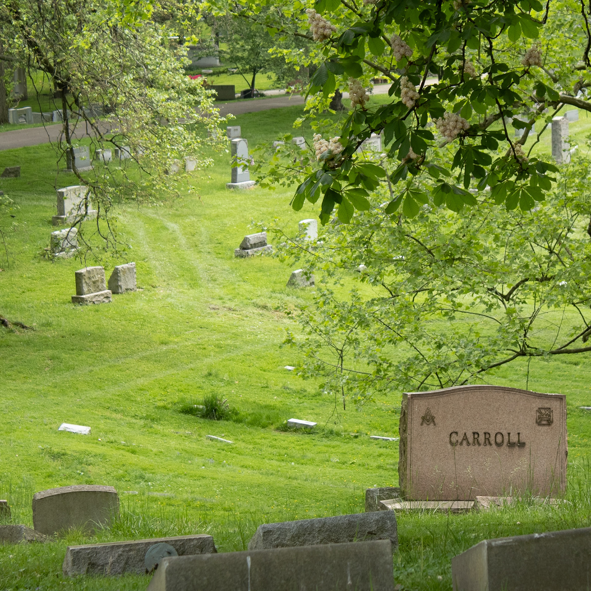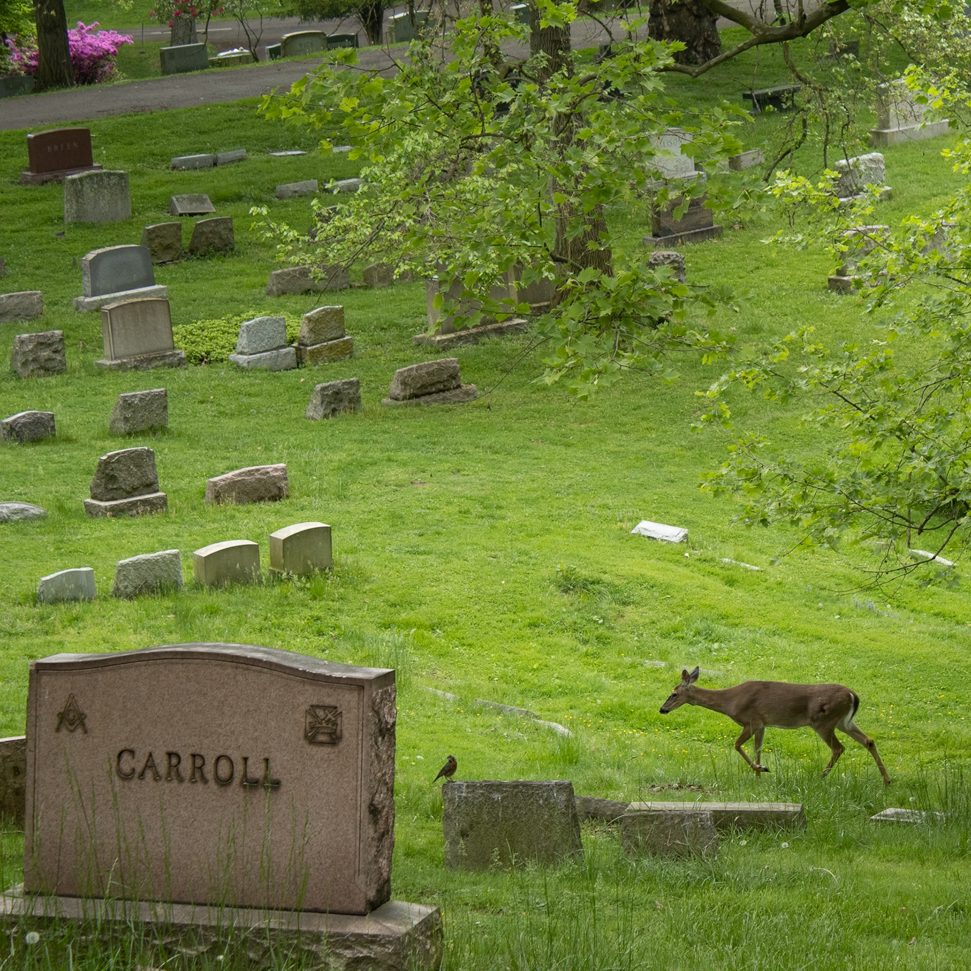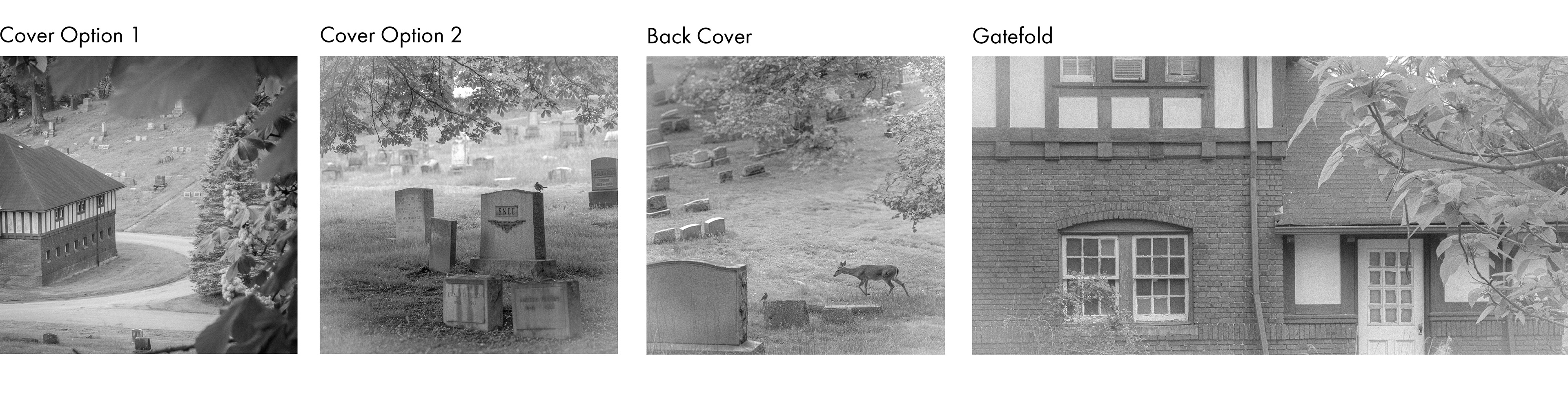 These images were taken at the Homewood Cemetery in Pittsburgh, Pennsylvania. The juxtaposition of the tombstones surrounded by greenery and animals relates to the themes of sitting with life and death in the record.