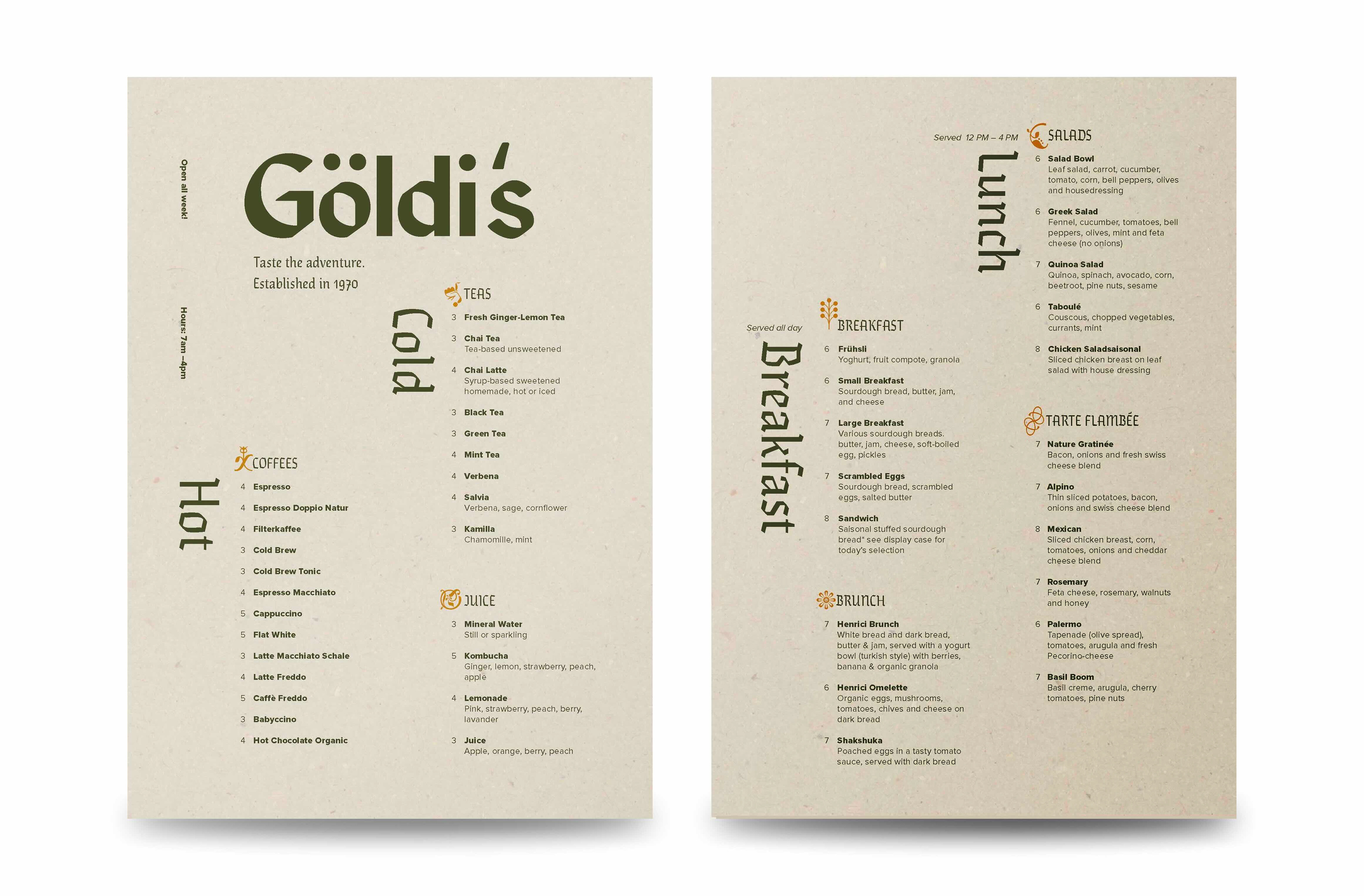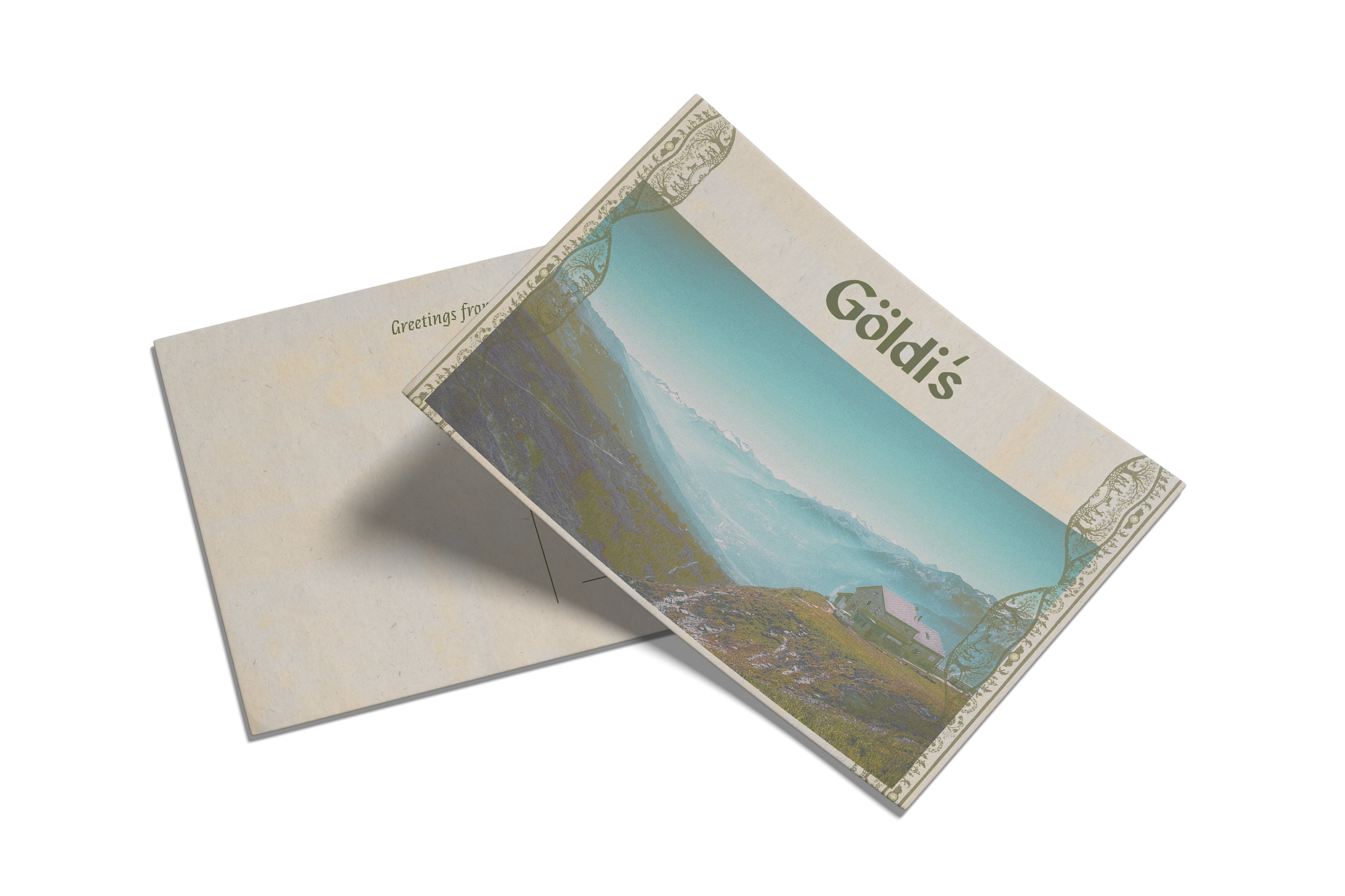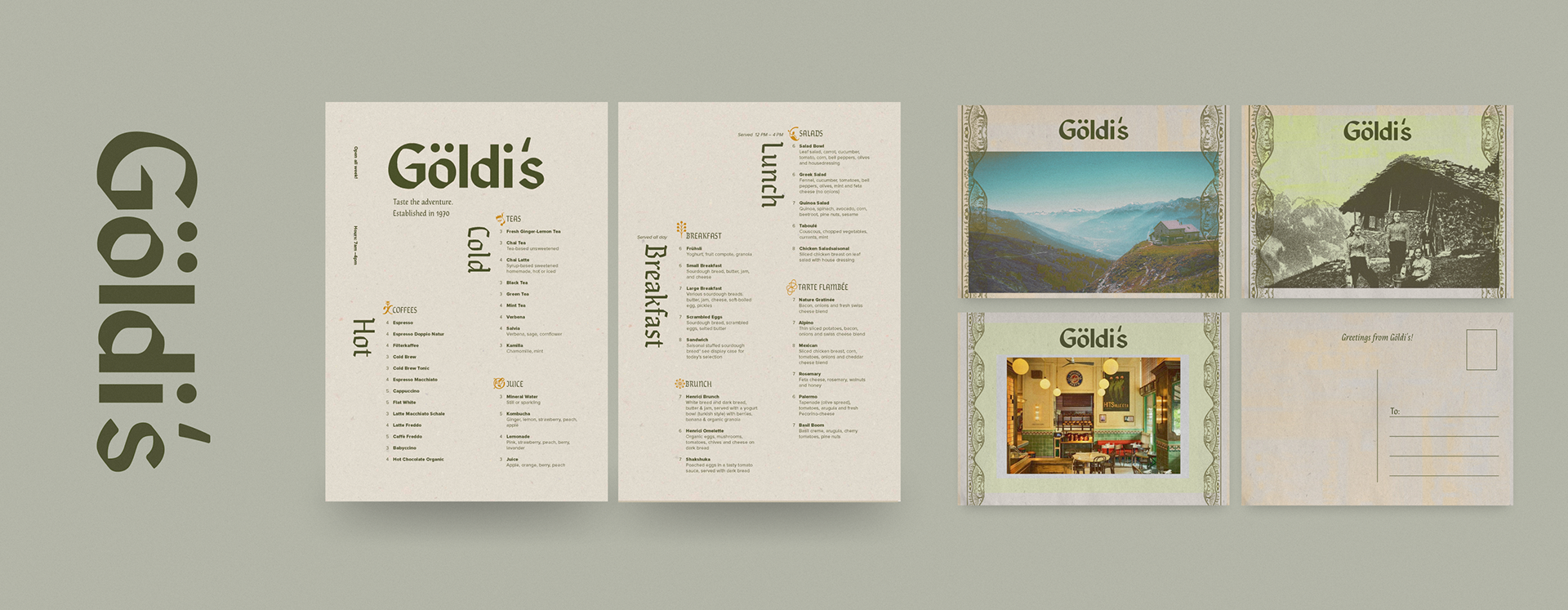 Adventure, education, and trust are the three core values of Göldi’s. The visual identity of the Göldis is explored through the cafe’s wordmark, menu, website, and postcard.