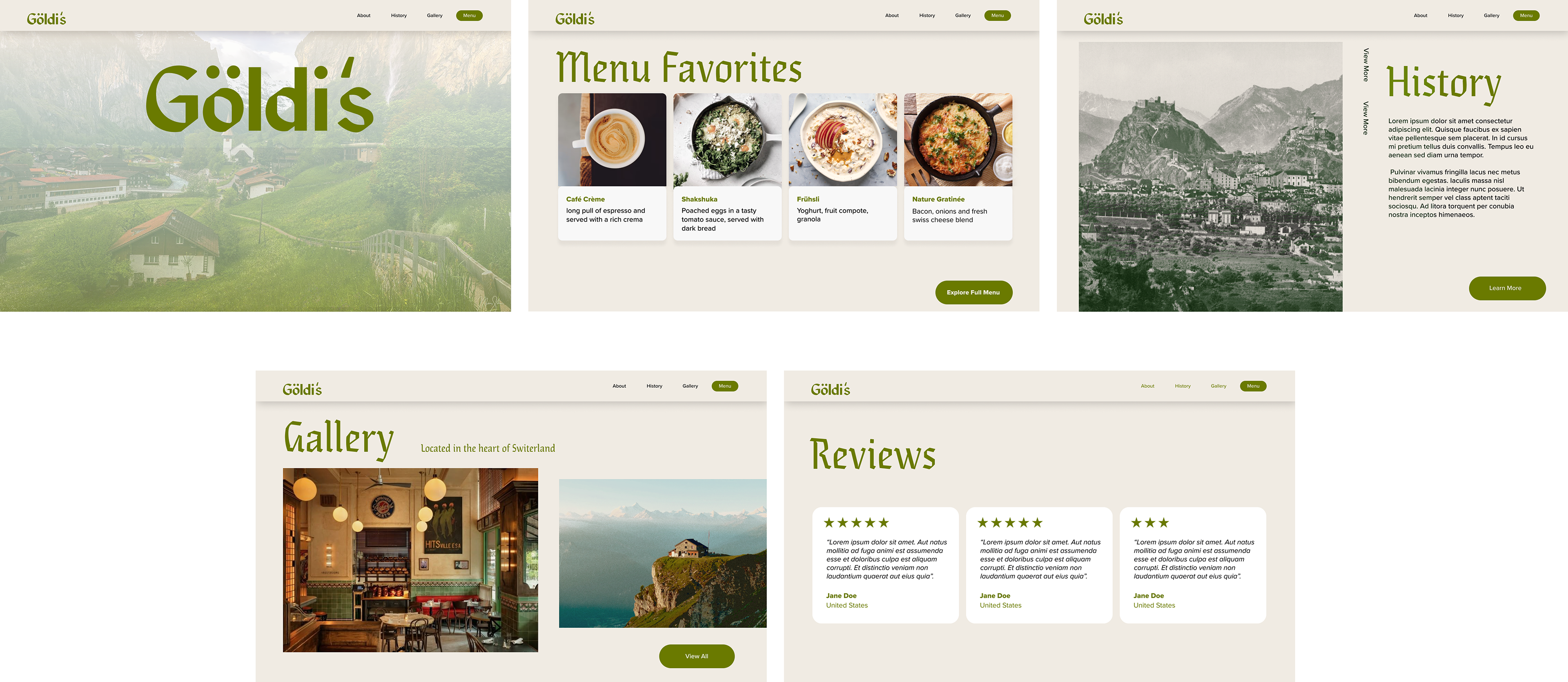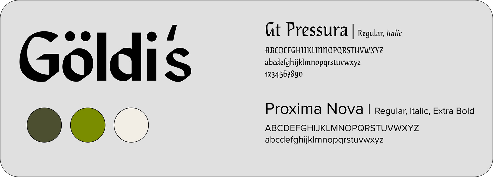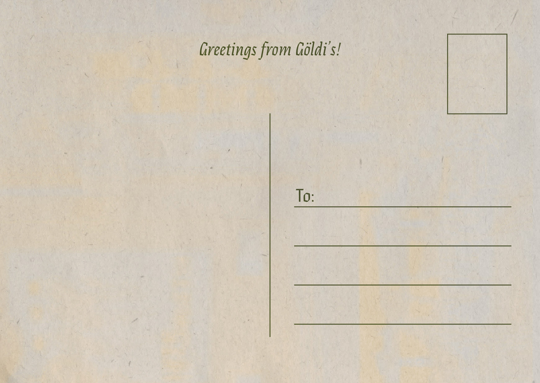 Adventure, education, and trust are the three core values of Göldi’s. The visual identity of the Göldis is explored through the cafe’s wordmark, menu, website, and postcard.