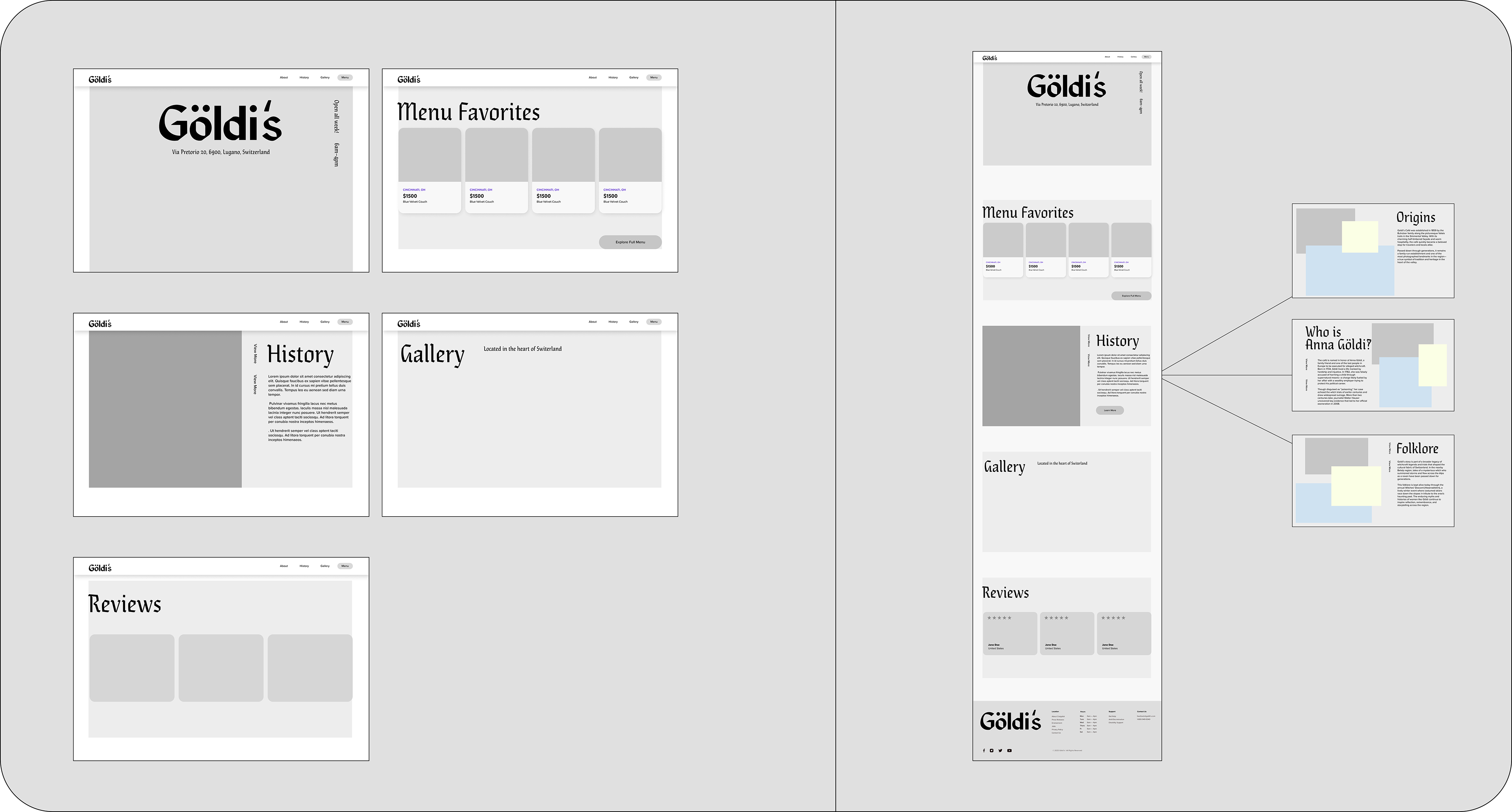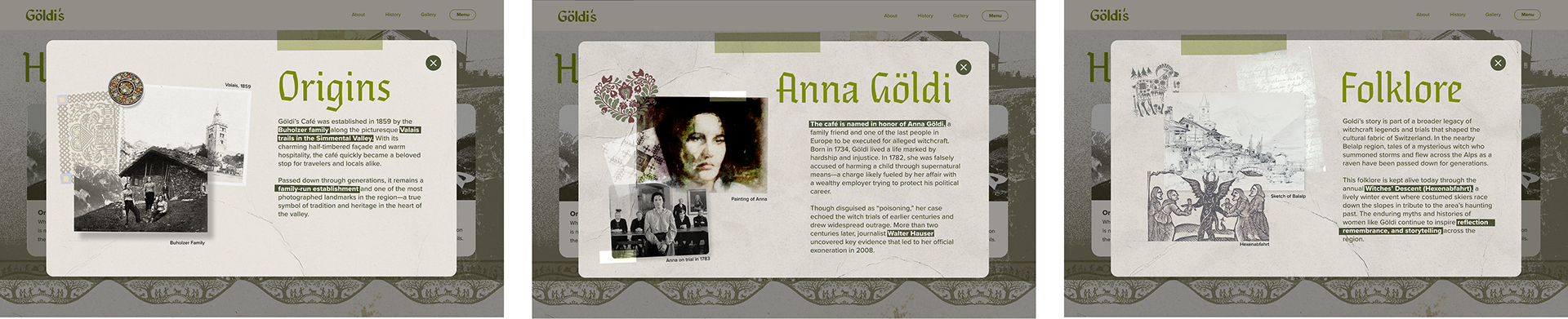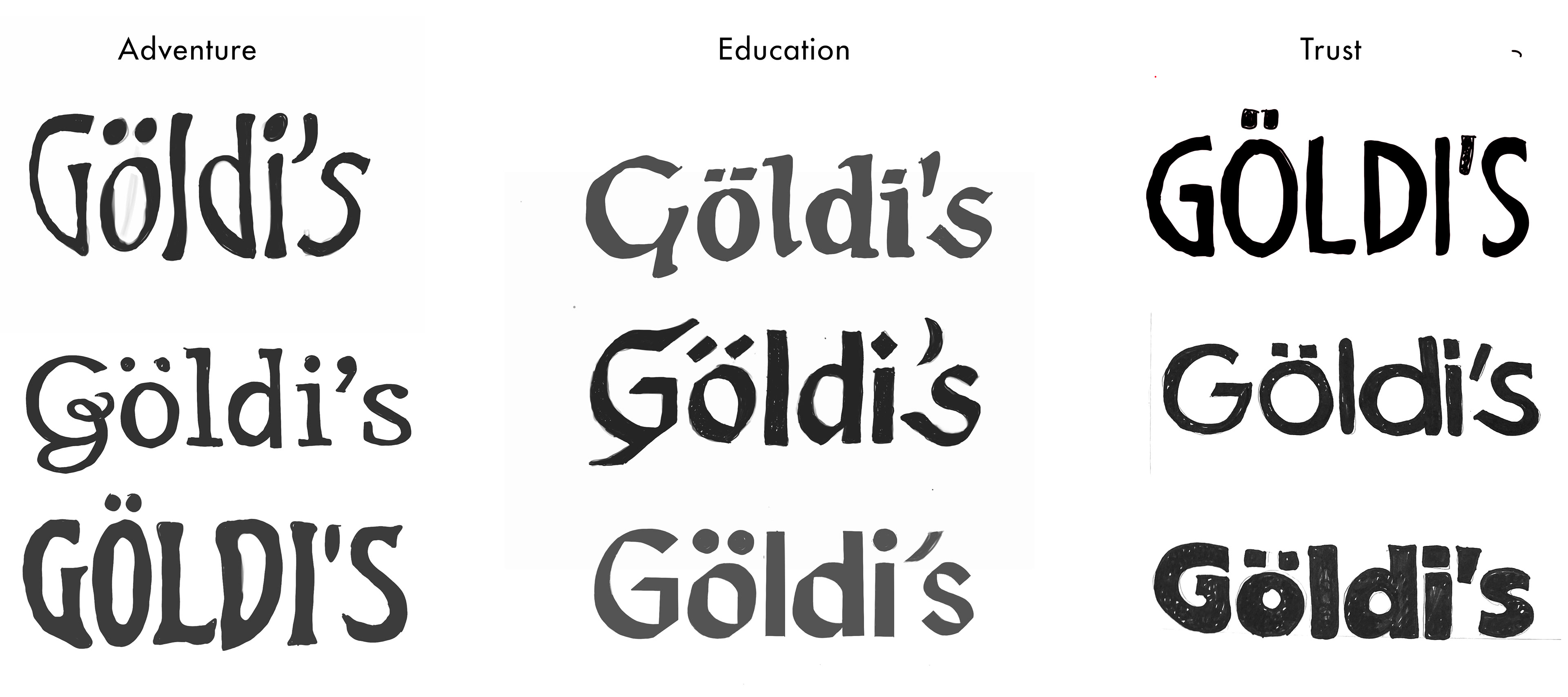 The first column explored the brand’s core value of adventure. Adventure is conveyed with the condensed modifications and embellished features, like the G in the middle wordmark. The second column centered on the theme of education. Because the cafe highlights the Swiss witch trials in the 1700s, an Old Style typeface was explored in this ideation. The third column focused on the theme of trust, exemplified in the roundness of the letterforms.