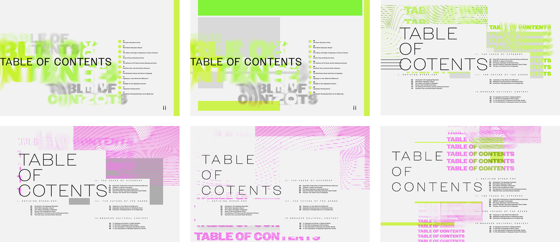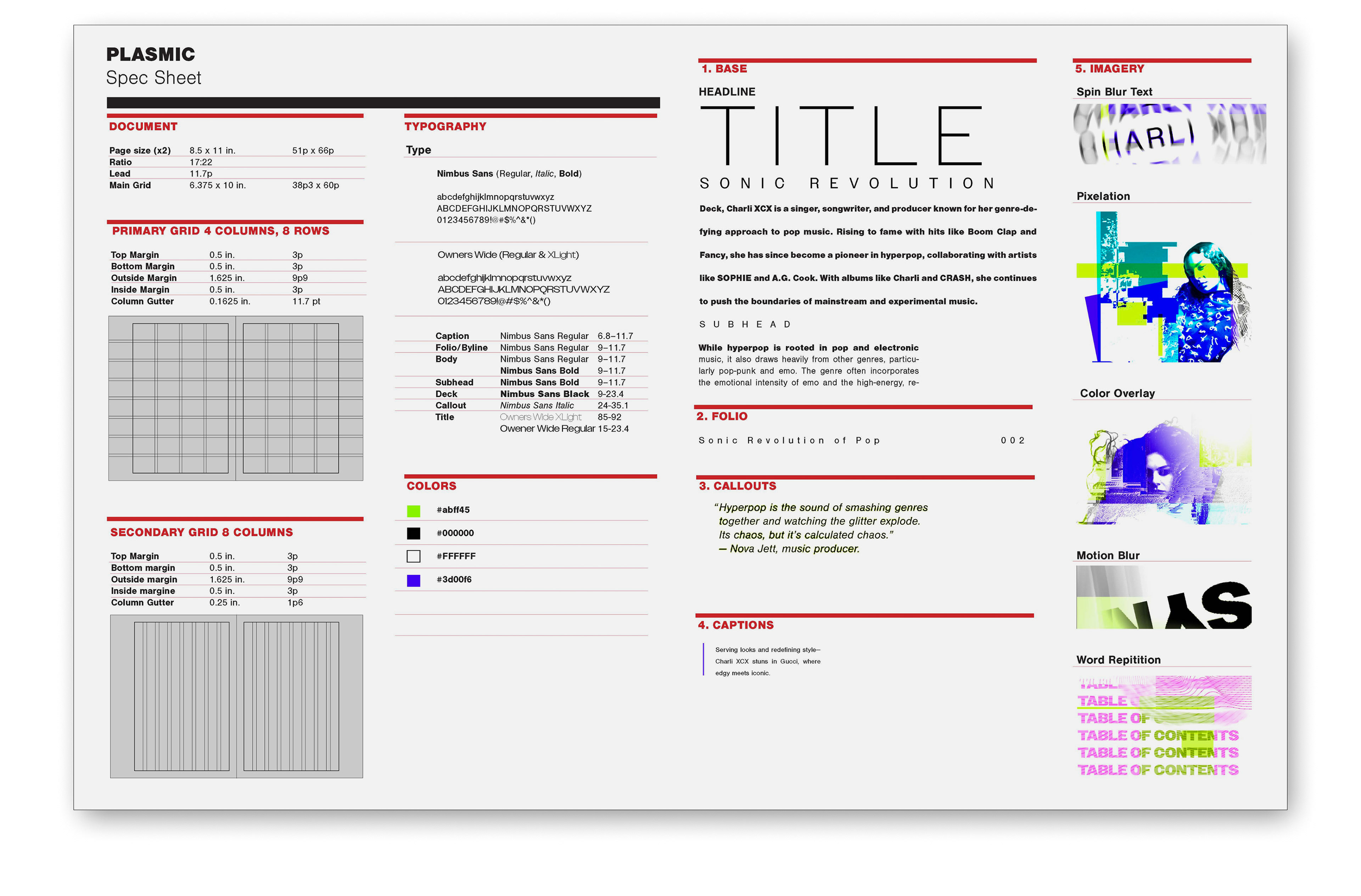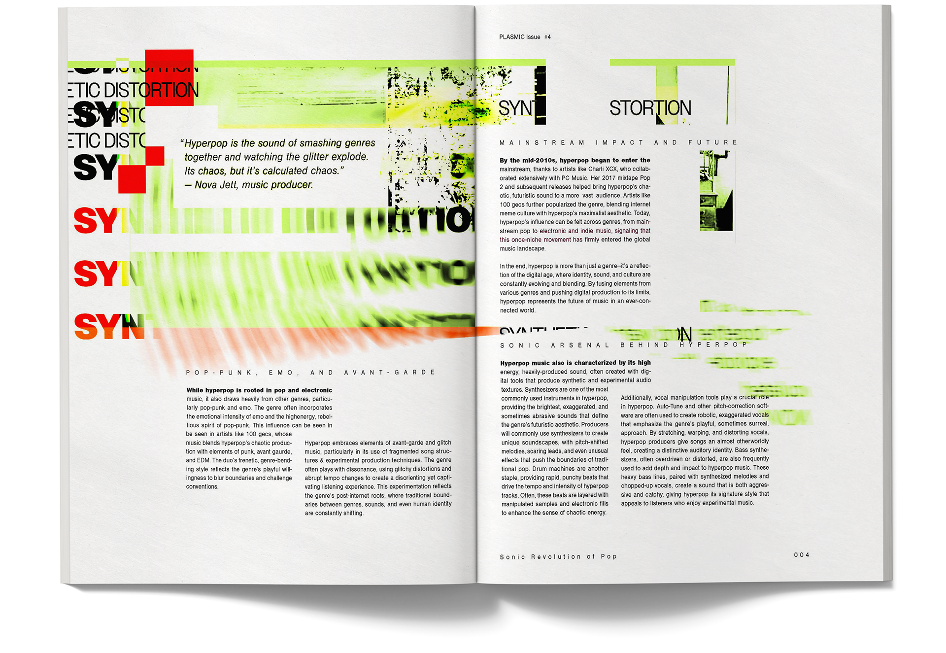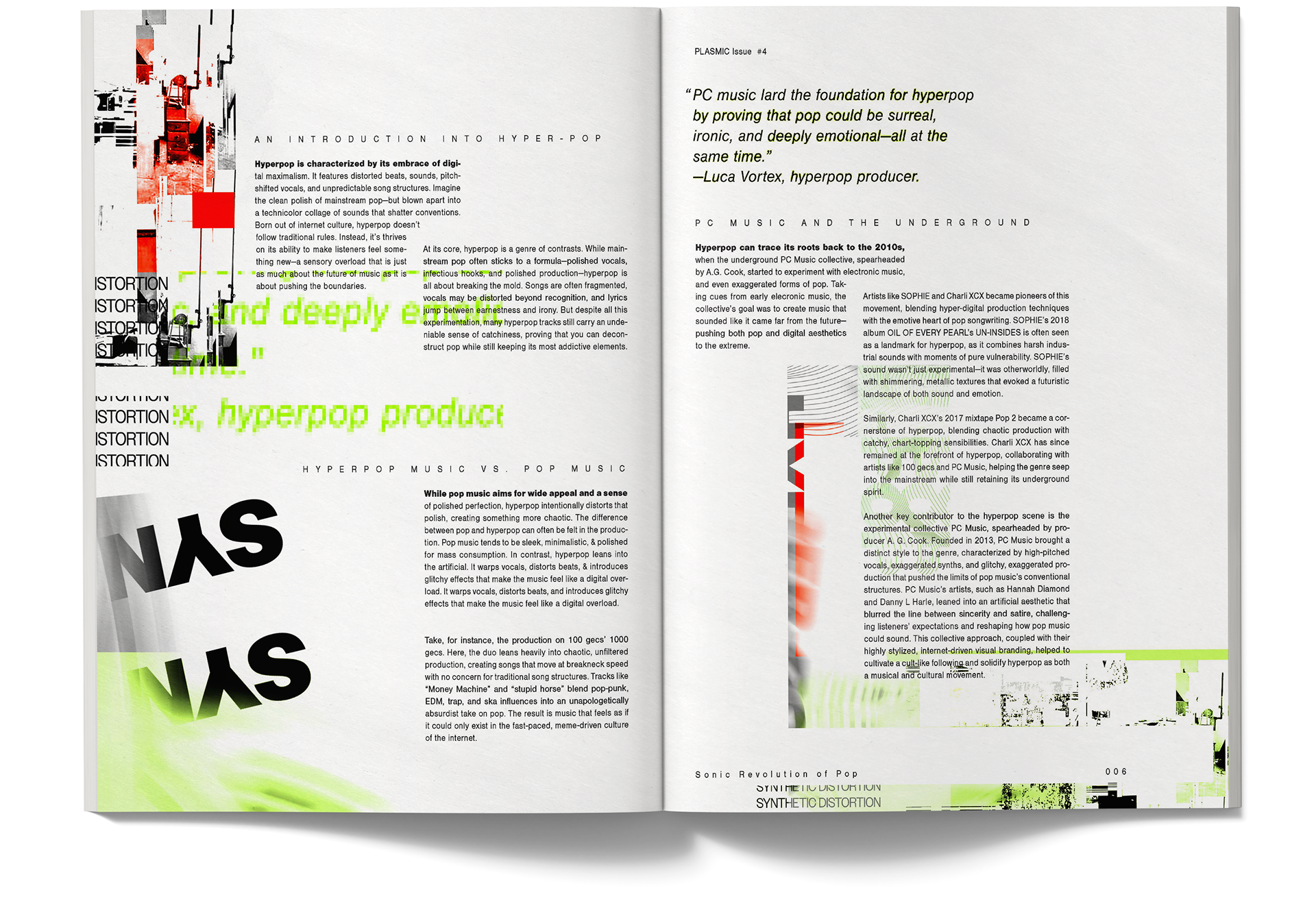 Plasmic is a hyper-pop music magazine publication about trailblazers and dominant artists in the hyper-pop music genre. Hyper-pop takes the conventional form of a pop song and manipulates it to extremes, using maximalist sounds. The distortion, acidic, and drilling sounds of hyper-pop directed the composition, typography, image treatment, and color of the publication’s visual identity.