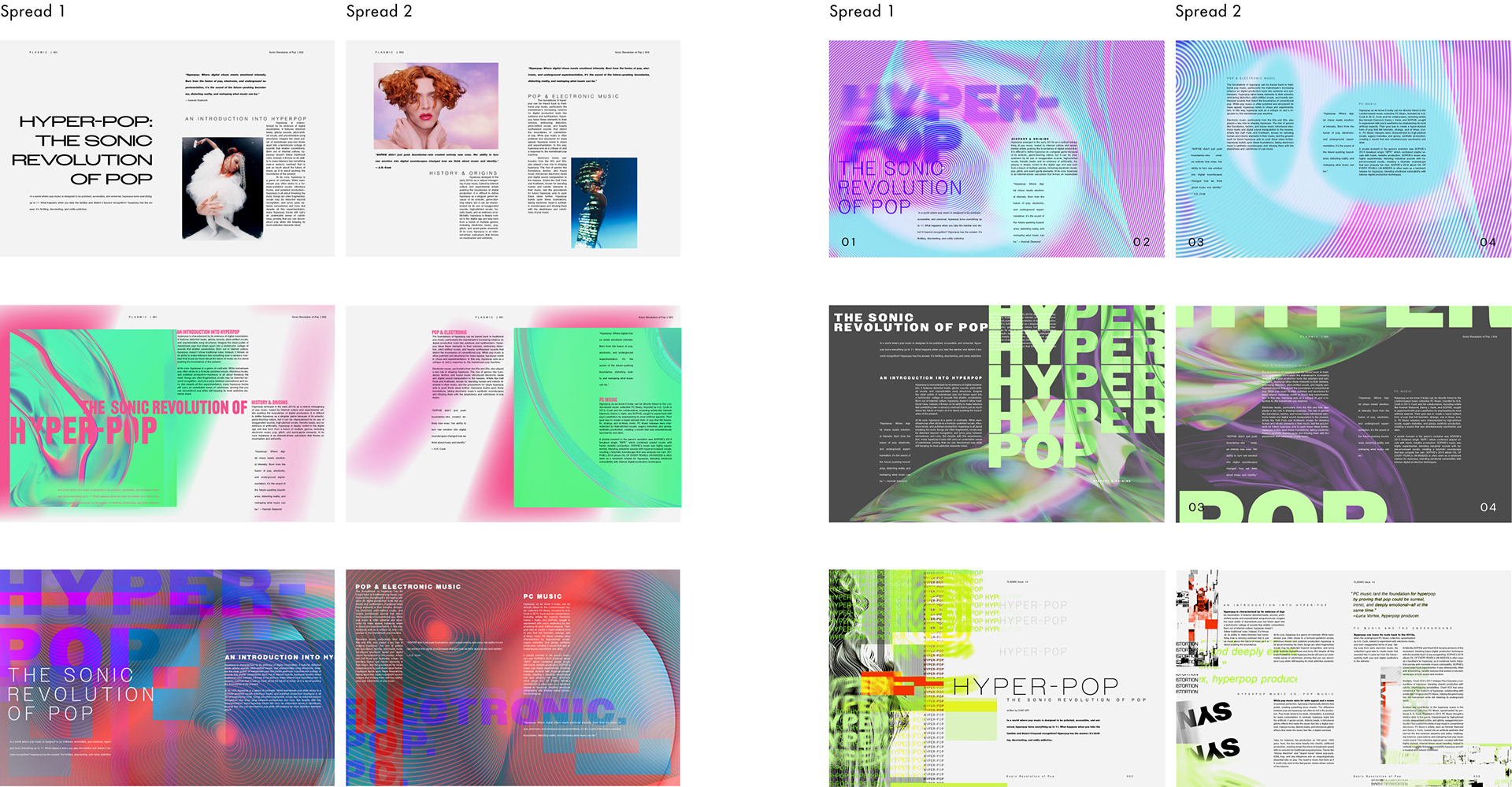 In the first column experimented with the fluidity of hyper-pop with the ligatures. The middle column conveyed how hyper-pop takes the average pop-song framework and pushes its aspects to sonic extremes. The disruption of the letter “S” in the wordmark represents how hyper-pop disrupts the pop space. The last column focused more on the technological aspects of hyper-pop, as there are more straight lines and corners.